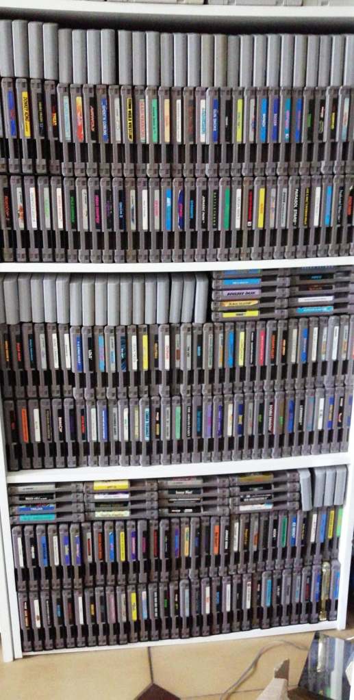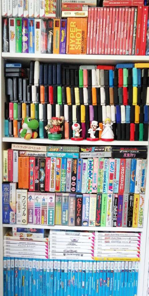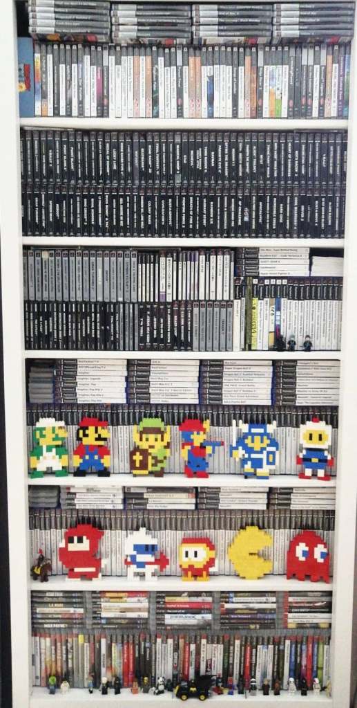 J’ai tenté de ranger les jeux par constructeur, mais ce fut long et rude ! J’ai presque réussi avec l’espace que j’ai, pour le moment c’est dans le salon.. mais un jour je ferais ma vraie gameroom !!